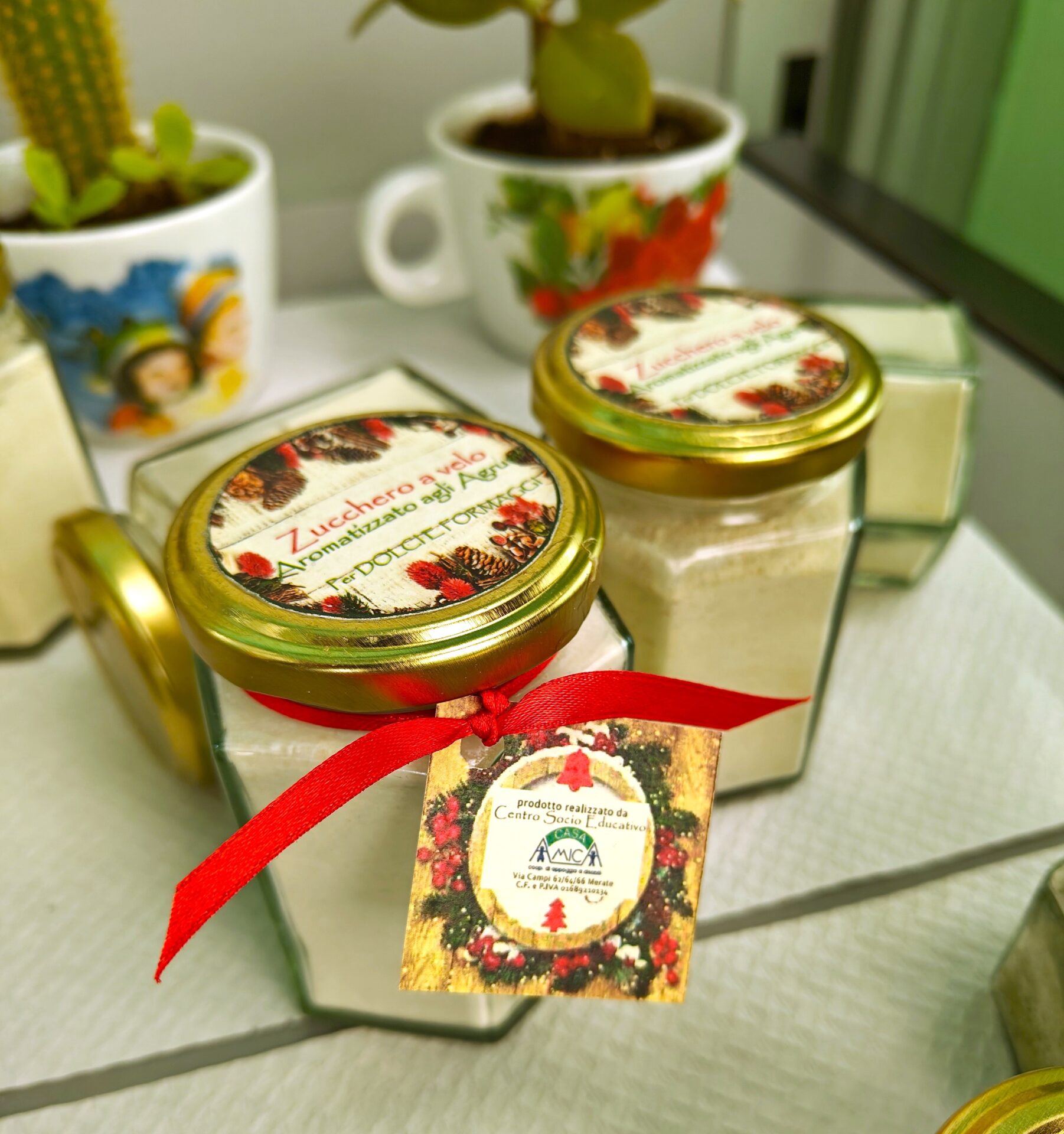 - ZUCCHERO AGLI AGRUMI: 5 utenti, 1 educatore. Produzione e confezionamento dello zucchero aromatizzato agli agrumi. Materiali: zucchero, agrumi vari, vasetti.