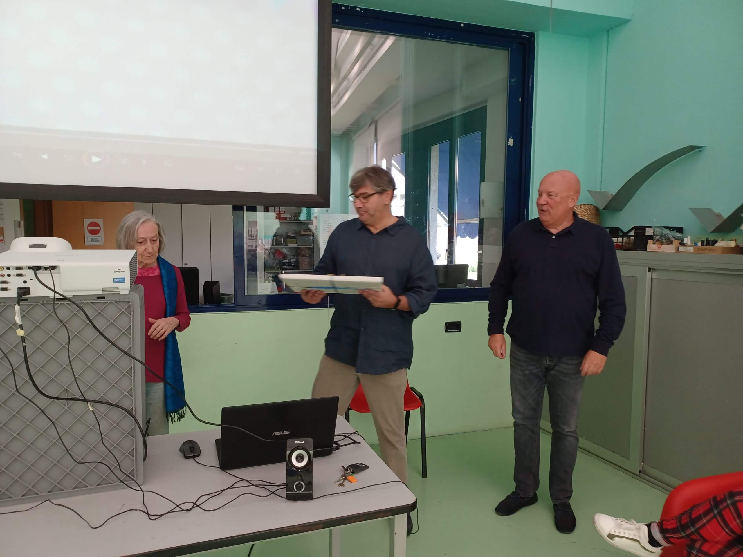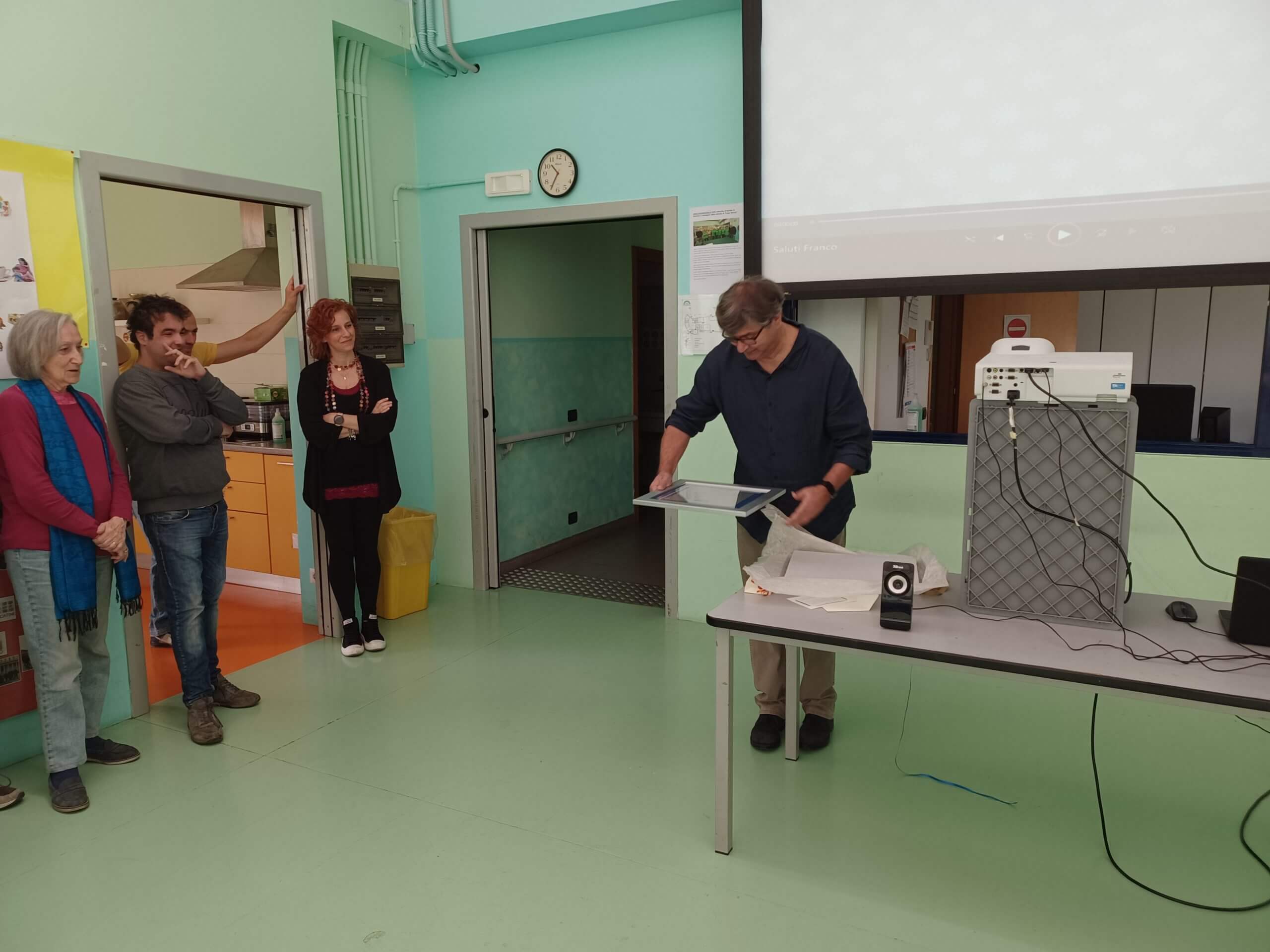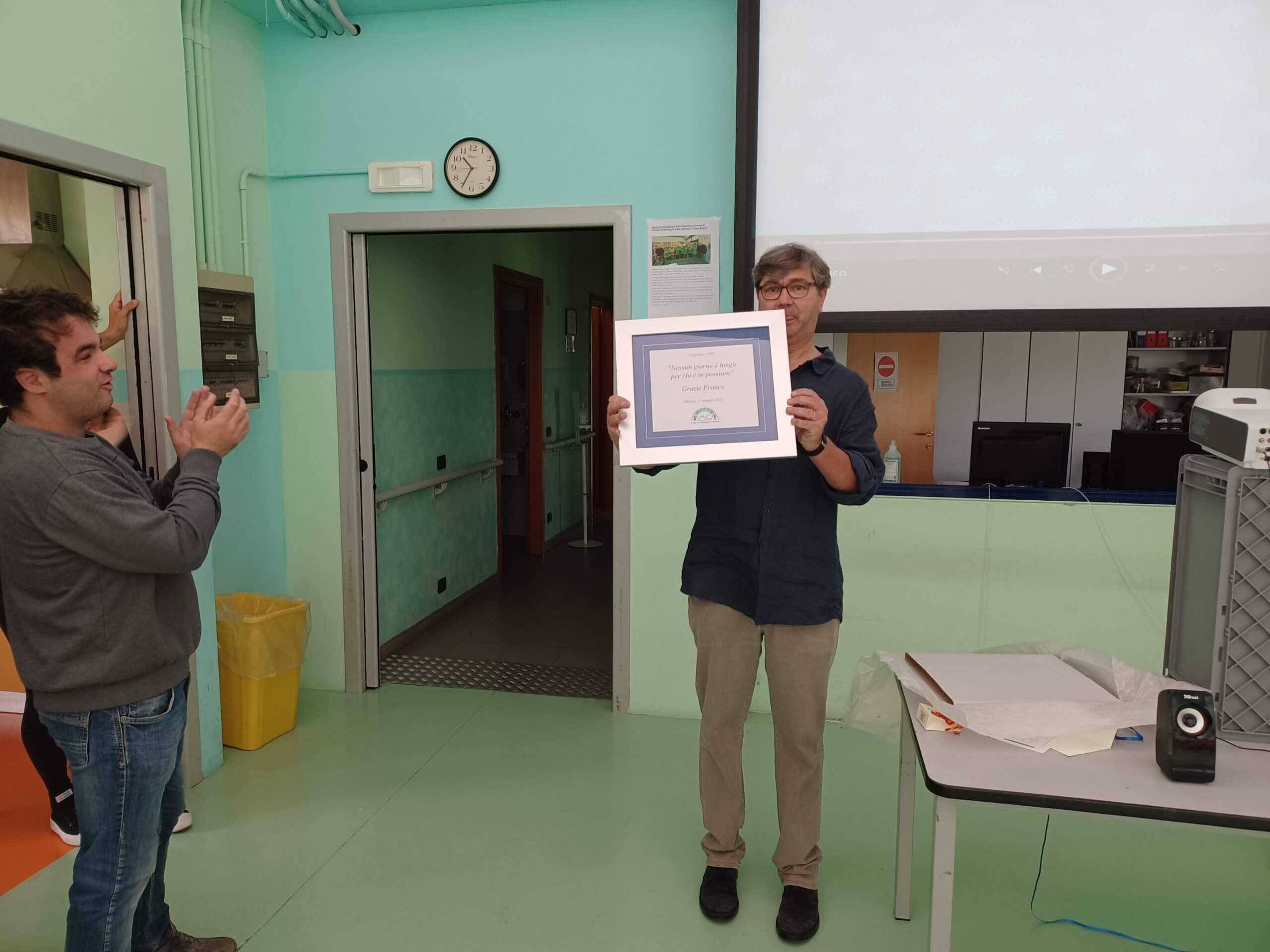 è stato proiettato un video di saluti e auguri, e gli è stata consegnata una targa. dopo tanti abbracci e qualche lacrima, siamo passati al ricco buffet!